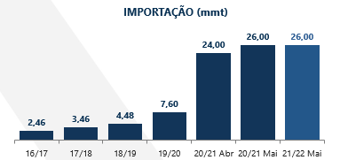 Outside, the market is attentive to the growth in the use of corn for the production of Ethanol in the USA, which is expected to increase by 4.5% in the 2021/22 cycle (more than 5 million tons) and, remembering, China started to figure as an importer in the world corn market. North American exports also tend to be high. Corn prices in China have risen more than a third in the most recent year, after a drop in production and state stocks. The country started to import more corn to make up for the internal deficit and this has been reflected in world cereal prices.